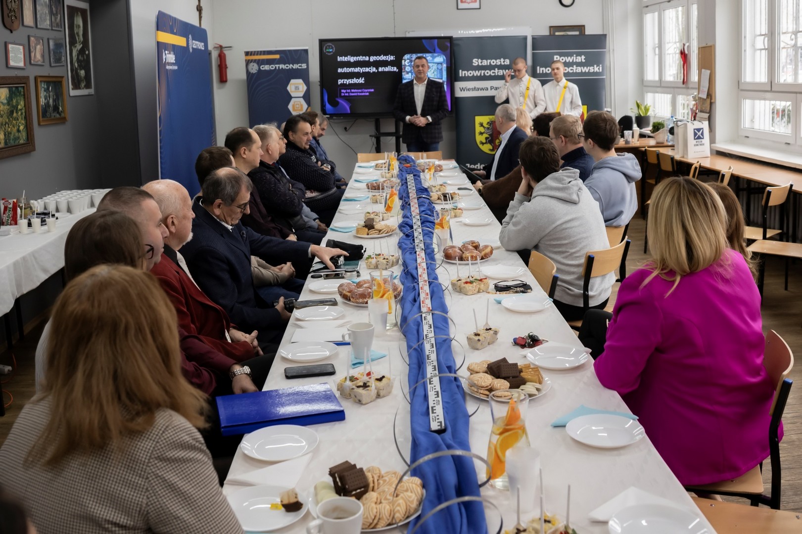 9 stycznia 2026 r. w naszej szkole odbyło się Spotkanie Geodetów oraz 15-lecie kierunku Technik geodeta. W spotkaniu wzięli udział Starosta Inowrocławski Wiesława Pawłowska, Wicestarosta Henryk Procek, Naczelnik Wydziału Edukacji, Sportu i Zdrowia Beata Kowalska, Naczelnik Wydziału Geodezji, Kartografii, Katastru i Gospodarki Nieruchomościami Bernarda Nowak, Prezes Stowarzyszenia Geodetów Polskich oddział w Bydgoszczy dr inż. Bolesław Krystowczyk, Wiceprezes Stowarzyszenia Geodetów Polskich oddział w Bydgoszczy Henryk Siuda, Geodeta Powiatowy Dawid Kaźmierski, dr inż Dawid Kwaśnik przedstawiciel Wydziału Geoinżynierii Uniwersytetu Warmińsko-Mazurskiego w Olsztynie, mgr inż. Mateusz Czyrzniak przedstawiciel Wydziału Geoinżynierii Uniwersytetu Warmińsko-Mazurskiego w Olsztynie, Bartosz Biskup przedstawiciel Geotronics Dystrybucja Sp. z o.o., oraz geodeci powiatu inowrocławskiego. Dyrektor Zespołu Szkół Budowlanych Marcin Kuls przywitał wszystkich zgromadzonych, następnie Starosta Inowrocławski Wiesława Pawłowska na ręce Dyrektora złożyła list gratulacyjny wraz z voucherem na zakup sprzętu geodezyjnego, a także życzyła wytrwałości, dokładności i sukcesów zawodowych oraz pomyślności, zdrowia i zaangażowania w rozwój geodezji. Prezes Stowarzyszenia Geodetów Polskich oddział w Bydgoszczy dr inż. Bolesław Krystowczyk wraz z Jakubem Nowickim Prezesem Koła SGP w Inowrocławiu wręczyli upominki uczniom biorącym udział w tegorocznej Olimpiadzie Wiedzy Geodezyjnej i Kartograficznej. Po części powitalnej przedstawiciele Wydziału Geoinżynierii Uniwersytetu Warmińsko-Mazurskiego w Olsztynie przeprowadzili wykład nt. „Inteligentna geodezja: automatyzacja, analiza, przyszłość”. Kolejnym punktem spotkania było szkolenie „Nowoczesne techniki pomiarowe w codziennej pracy geodety” poprowadzone przez przedstawiciela firmy Geotronics Dystrybucja Sp. z o. o. Część szkoleniową zakończyło wystąpienie Anny Cyrklaf Przedstawicielki Wydziału Geodezji, Kartografii, Katastru i Gospodarki Nieruchomościami Starostwa Powiatowego w Inowrocławiu, które dotyczyło współpracy Wydziału z wykonawcami prac geodezyjnych. Całość spotkania zwieńczył wspólny poczęstunek, podczas którego nie brakowało indywidualnych rozmów, wymiany doświadczeń i spostrzeżeń. To spotkanie pokazało, że geodezja łączy w wielu aspektach życia i wniosło wiele dobrego w rozwój tej dziedziny w naszym regionie.