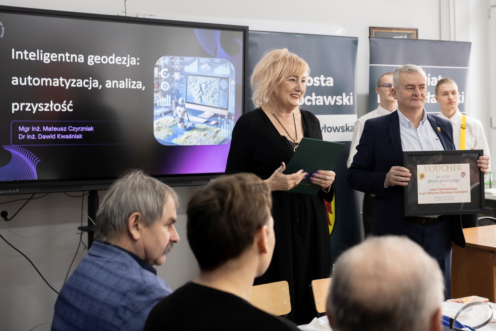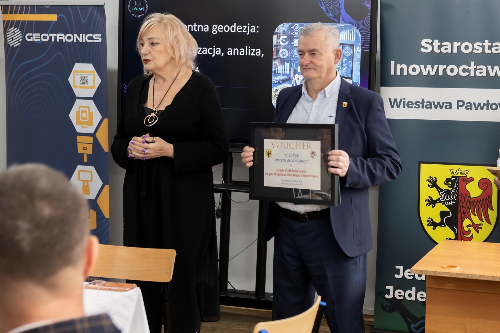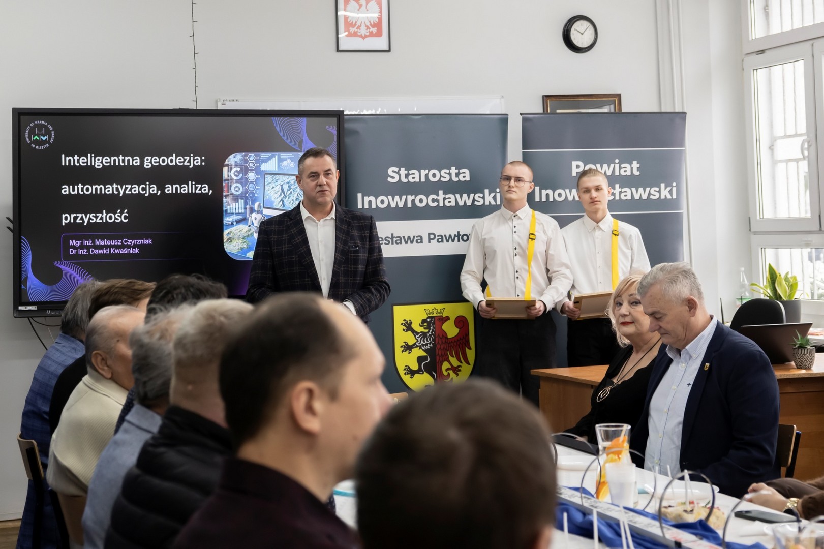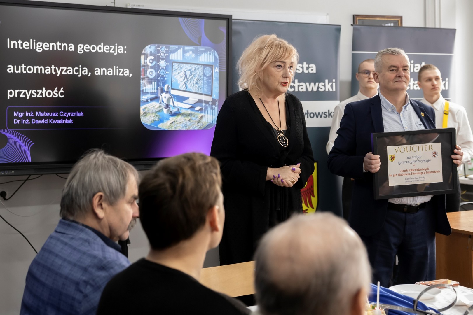 9 stycznia 2026 r. w naszej szkole odbyło się Spotkanie Geodetów oraz 15-lecie kierunku Technik geodeta. W spotkaniu wzięli udział Starosta Inowrocławski Wiesława Pawłowska, Wicestarosta Henryk Procek, Naczelnik Wydziału Edukacji, Sportu i Zdrowia Beata Kowalska, Naczelnik Wydziału Geodezji, Kartografii, Katastru i Gospodarki Nieruchomościami Bernarda Nowak, Prezes Stowarzyszenia Geodetów Polskich oddział w Bydgoszczy dr inż. Bolesław Krystowczyk, Wiceprezes Stowarzyszenia Geodetów Polskich oddział w Bydgoszczy Henryk Siuda, Geodeta Powiatowy Dawid Kaźmierski, dr inż Dawid Kwaśnik przedstawiciel Wydziału Geoinżynierii Uniwersytetu Warmińsko-Mazurskiego w Olsztynie, mgr inż. Mateusz Czyrzniak przedstawiciel Wydziału Geoinżynierii Uniwersytetu Warmińsko-Mazurskiego w Olsztynie, Bartosz Biskup przedstawiciel Geotronics Dystrybucja Sp. z o.o., oraz geodeci powiatu inowrocławskiego. Dyrektor Zespołu Szkół Budowlanych Marcin Kuls przywitał wszystkich zgromadzonych, następnie Starosta Inowrocławski Wiesława Pawłowska na ręce Dyrektora złożyła list gratulacyjny wraz z voucherem na zakup sprzętu geodezyjnego, a także życzyła wytrwałości, dokładności i sukcesów zawodowych oraz pomyślności, zdrowia i zaangażowania w rozwój geodezji. Prezes Stowarzyszenia Geodetów Polskich oddział w Bydgoszczy dr inż. Bolesław Krystowczyk wraz z Jakubem Nowickim Prezesem Koła SGP w Inowrocławiu wręczyli upominki uczniom biorącym udział w tegorocznej Olimpiadzie Wiedzy Geodezyjnej i Kartograficznej. Po części powitalnej przedstawiciele Wydziału Geoinżynierii Uniwersytetu Warmińsko-Mazurskiego w Olsztynie przeprowadzili wykład nt. „Inteligentna geodezja: automatyzacja, analiza, przyszłość”. Kolejnym punktem spotkania było szkolenie „Nowoczesne techniki pomiarowe w codziennej pracy geodety” poprowadzone przez przedstawiciela firmy Geotronics Dystrybucja Sp. z o. o. Część szkoleniową zakończyło wystąpienie Anny Cyrklaf Przedstawicielki Wydziału Geodezji, Kartografii, Katastru i Gospodarki Nieruchomościami Starostwa Powiatowego w Inowrocławiu, które dotyczyło współpracy Wydziału z wykonawcami prac geodezyjnych. Całość spotkania zwieńczył wspólny poczęstunek, podczas którego nie brakowało indywidualnych rozmów, wymiany doświadczeń i spostrzeżeń. To spotkanie pokazało, że geodezja łączy w wielu aspektach życia i wniosło wiele dobrego w rozwój tej dziedziny w naszym regionie.