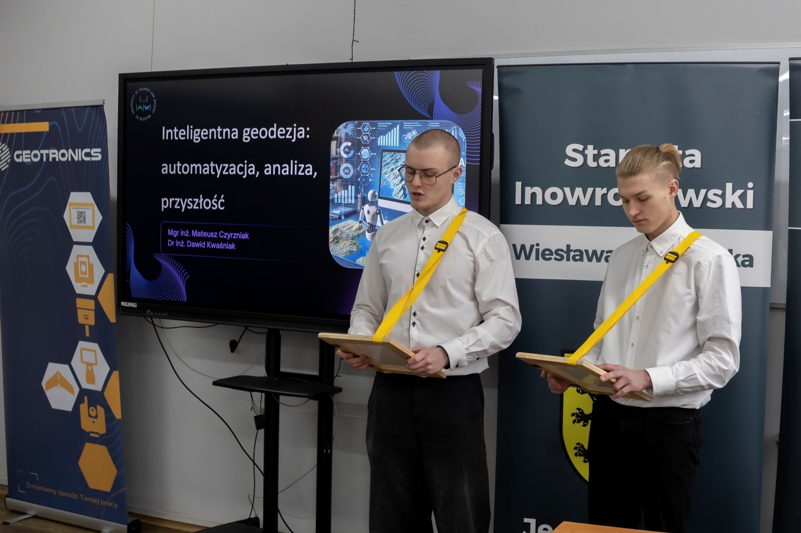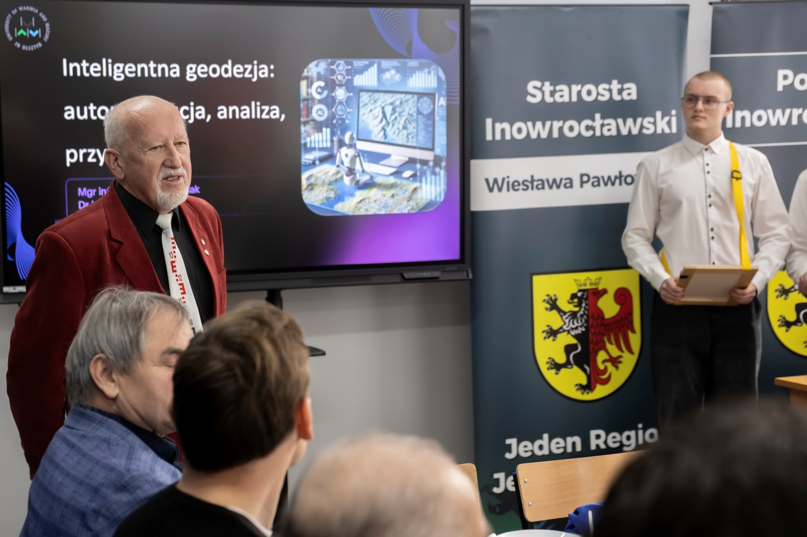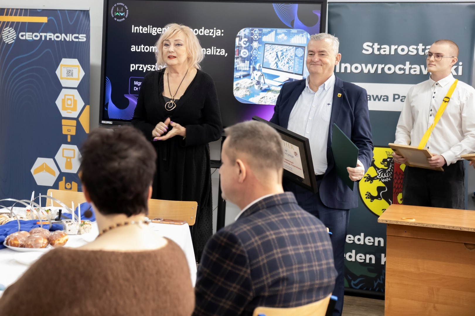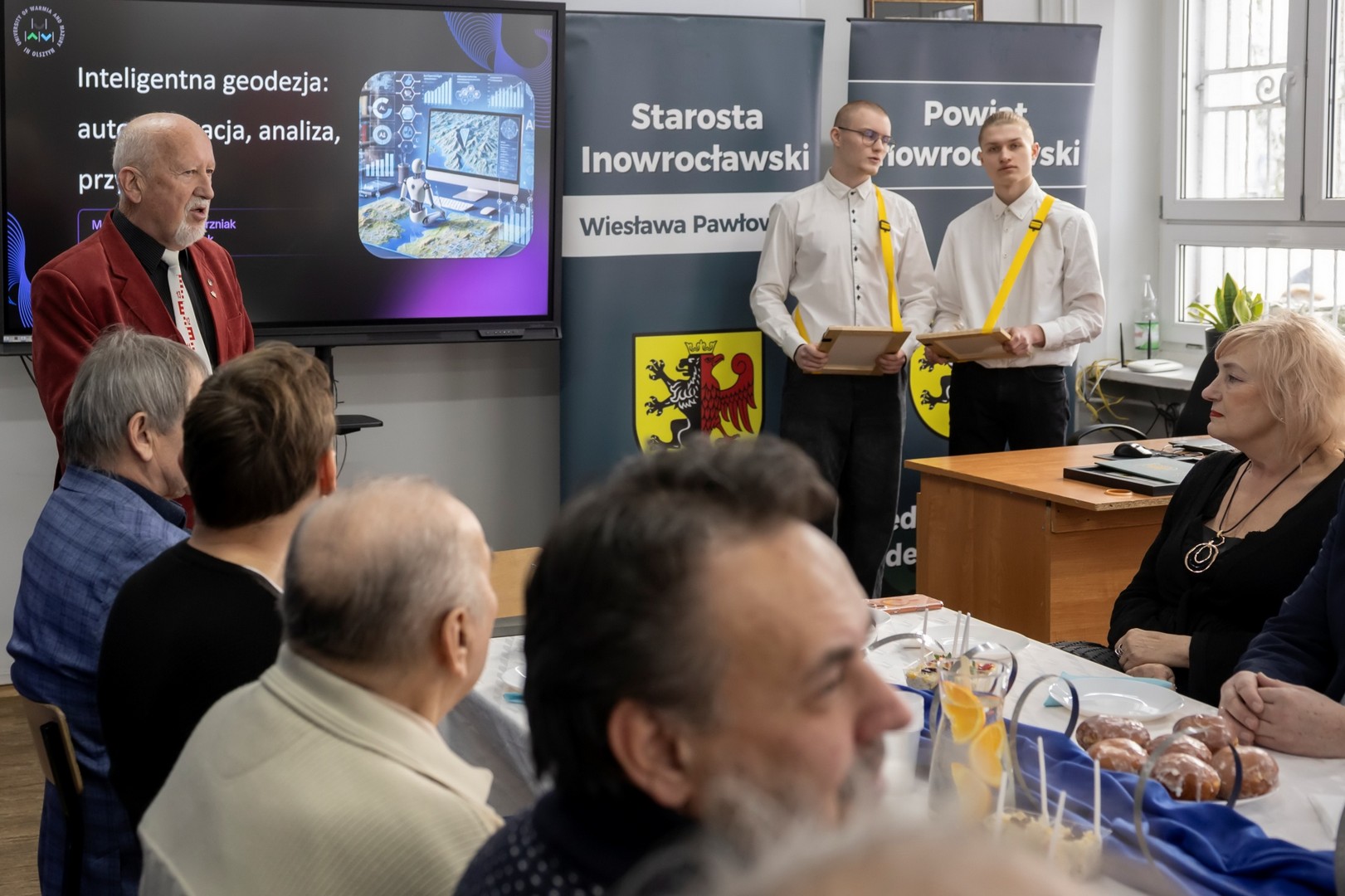 9 stycznia 2026 r. w naszej szkole odbyło się Spotkanie Geodetów oraz 15-lecie kierunku Technik geodeta. W spotkaniu wzięli udział Starosta Inowrocławski Wiesława Pawłowska, Wicestarosta Henryk Procek, Naczelnik Wydziału Edukacji, Sportu i Zdrowia Beata Kowalska, Naczelnik Wydziału Geodezji, Kartografii, Katastru i Gospodarki Nieruchomościami Bernarda Nowak, Prezes Stowarzyszenia Geodetów Polskich oddział w Bydgoszczy dr inż. Bolesław Krystowczyk, Wiceprezes Stowarzyszenia Geodetów Polskich oddział w Bydgoszczy Henryk Siuda, Geodeta Powiatowy Dawid Kaźmierski, dr inż Dawid Kwaśnik przedstawiciel Wydziału Geoinżynierii Uniwersytetu Warmińsko-Mazurskiego w Olsztynie, mgr inż. Mateusz Czyrzniak przedstawiciel Wydziału Geoinżynierii Uniwersytetu Warmińsko-Mazurskiego w Olsztynie, Bartosz Biskup przedstawiciel Geotronics Dystrybucja Sp. z o.o., oraz geodeci powiatu inowrocławskiego. Dyrektor Zespołu Szkół Budowlanych Marcin Kuls przywitał wszystkich zgromadzonych, następnie Starosta Inowrocławski Wiesława Pawłowska na ręce Dyrektora złożyła list gratulacyjny wraz z voucherem na zakup sprzętu geodezyjnego, a także życzyła wytrwałości, dokładności i sukcesów zawodowych oraz pomyślności, zdrowia i zaangażowania w rozwój geodezji. Prezes Stowarzyszenia Geodetów Polskich oddział w Bydgoszczy dr inż. Bolesław Krystowczyk wraz z Jakubem Nowickim Prezesem Koła SGP w Inowrocławiu wręczyli upominki uczniom biorącym udział w tegorocznej Olimpiadzie Wiedzy Geodezyjnej i Kartograficznej. Po części powitalnej przedstawiciele Wydziału Geoinżynierii Uniwersytetu Warmińsko-Mazurskiego w Olsztynie przeprowadzili wykład nt. „Inteligentna geodezja: automatyzacja, analiza, przyszłość”. Kolejnym punktem spotkania było szkolenie „Nowoczesne techniki pomiarowe w codziennej pracy geodety” poprowadzone przez przedstawiciela firmy Geotronics Dystrybucja Sp. z o. o. Część szkoleniową zakończyło wystąpienie Anny Cyrklaf Przedstawicielki Wydziału Geodezji, Kartografii, Katastru i Gospodarki Nieruchomościami Starostwa Powiatowego w Inowrocławiu, które dotyczyło współpracy Wydziału z wykonawcami prac geodezyjnych. Całość spotkania zwieńczył wspólny poczęstunek, podczas którego nie brakowało indywidualnych rozmów, wymiany doświadczeń i spostrzeżeń. To spotkanie pokazało, że geodezja łączy w wielu aspektach życia i wniosło wiele dobrego w rozwój tej dziedziny w naszym regionie.