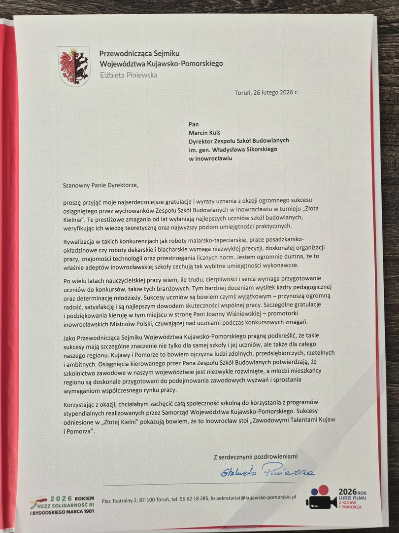 Dziś w naszej szkole mieliśmy bardzo miłą i wyjątkową wizytę. Pani Monika Dąbrowska, Kierownik Biura Przewodniczącej Sejmiku Województwa Kujawsko-Pomorskiego, przekazała na ręce Dyrektora Marcina Kulsa list gratulacyjny od Przewodniczącej Sejmiku Województwa Kujawsko-Pomorskiego Elżbiety Piniewskiej. List jest wyrazem uznania dla ogromnego sukcesu uczniów Zespołu Szkół Budowlanych w Inowrocławiu, którzy znakomicie zaprezentowali się w prestiżowym ogólnopolskim turnieju „Złota Kielnia”. W swoim piśmie Pani Przewodnicząca podkreśliła wysoki poziom umiejętności naszych uczniów, zaangażowanie nauczycieli oraz znaczenie szkolnictwa zawodowego w regionie Kujaw i Pomorza. To wyróżnienie jest dla całej społeczności szkolnej powodem do dumy i motywacją do dalszej pracy. Gratulujemy naszym uczniom, nauczycielom oraz wszystkim, którzy przyczyniają się do kolejnych sukcesów naszej szkoły!