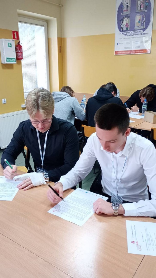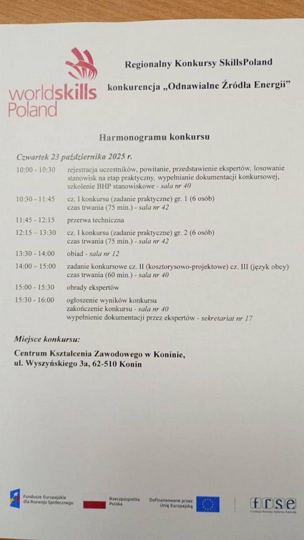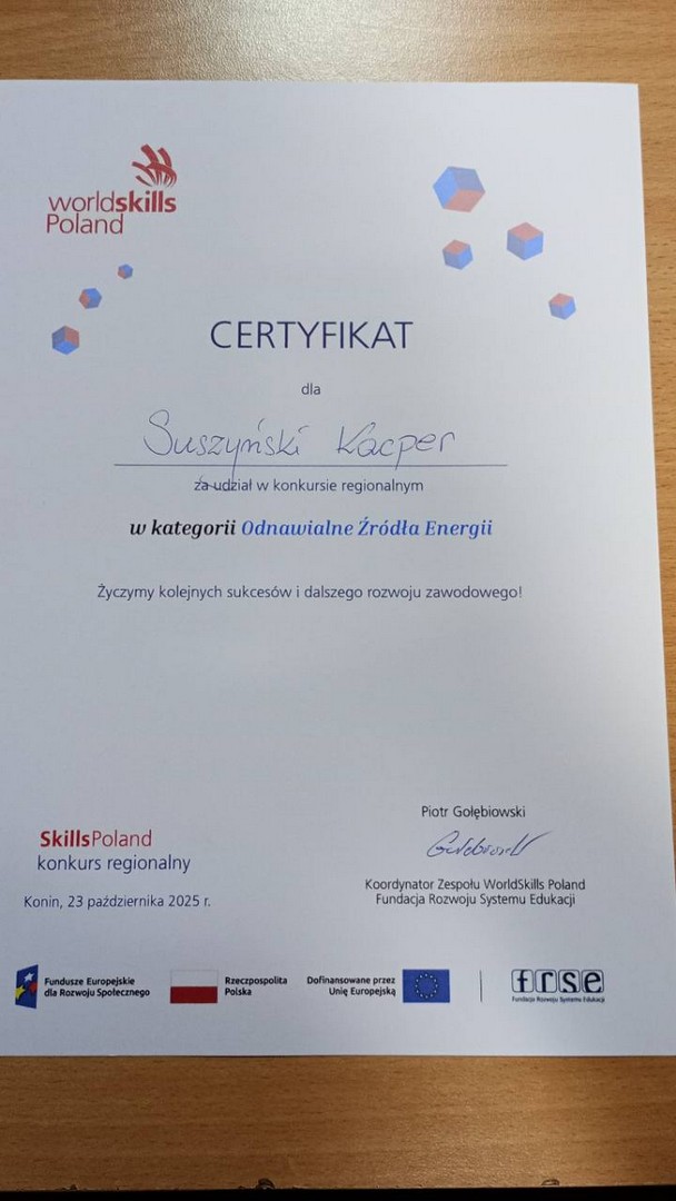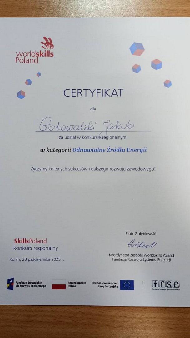 W dniu 24 października 2025 roku uczniowie klasy 4d: Jakub Gotowalski oraz Kacper Suszyński reprezentowali Zespół Szkół Budowlanych im. gen. Władysława Sikorskiego w Inowrocławiu podczas regionalnego konkursu WorldSkills Poland w dziedzinie „Odnawialne Źródła Energii”, który odbył się w Centrum Kształcenia Zawodowego w Koninie. Podczas rywalizacji młodzi pasjonaci nowoczesnych technologii mieli okazję sprawdzić swoją wiedzę z języka angielskiego, wykonywania kosztorysu i umiejętności praktyczne w zakresie instalacji systemów wykorzystujących energię odnawialną – takich jak panele fotowoltaiczne, pompy ciepła czy systemy solarne. Udział w konkursie pozwolił uczniom nie tylko poszerzyć swoje kompetencje zawodowe, ale także zdobyć cenne doświadczenie i poznać najnowsze trendy w branży energetyki odnawialnej. Nasi uczniowie znaleźli się w finale konkursu, wsród 12 uczestników z całej Polski, po uzyskaniu bardzo dobrego wyniku z testu wiedzy o OZE. Wykazali się dużym zaangażowaniem, profesjonalizmem i pasją do zawodu. Ich udział w konkursie jest dowodem na wysoki poziom kształcenia zawodowego w naszej szkole oraz potwierdzeniem, że młode pokolenie techników z inowrocławskiej Budowlanki jest dobrze przygotowane do wyzwań współczesnego rynku pracy.Gratulujemy Jakubowi i Kacprowi oraz opiekunowi merytorycznemu – pani Justynie Dybicz. Dziękujemy za godne reprezentowanie naszej szkoły i życzymy dalszych sukcesów w kolejnych konkursach.