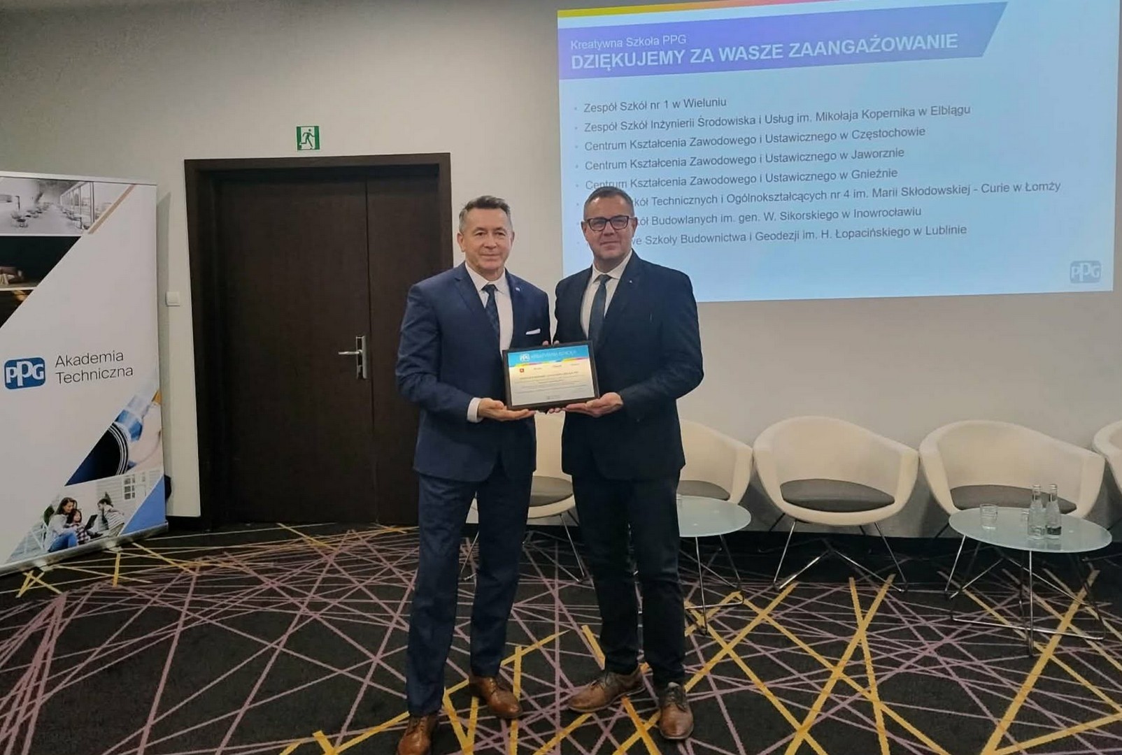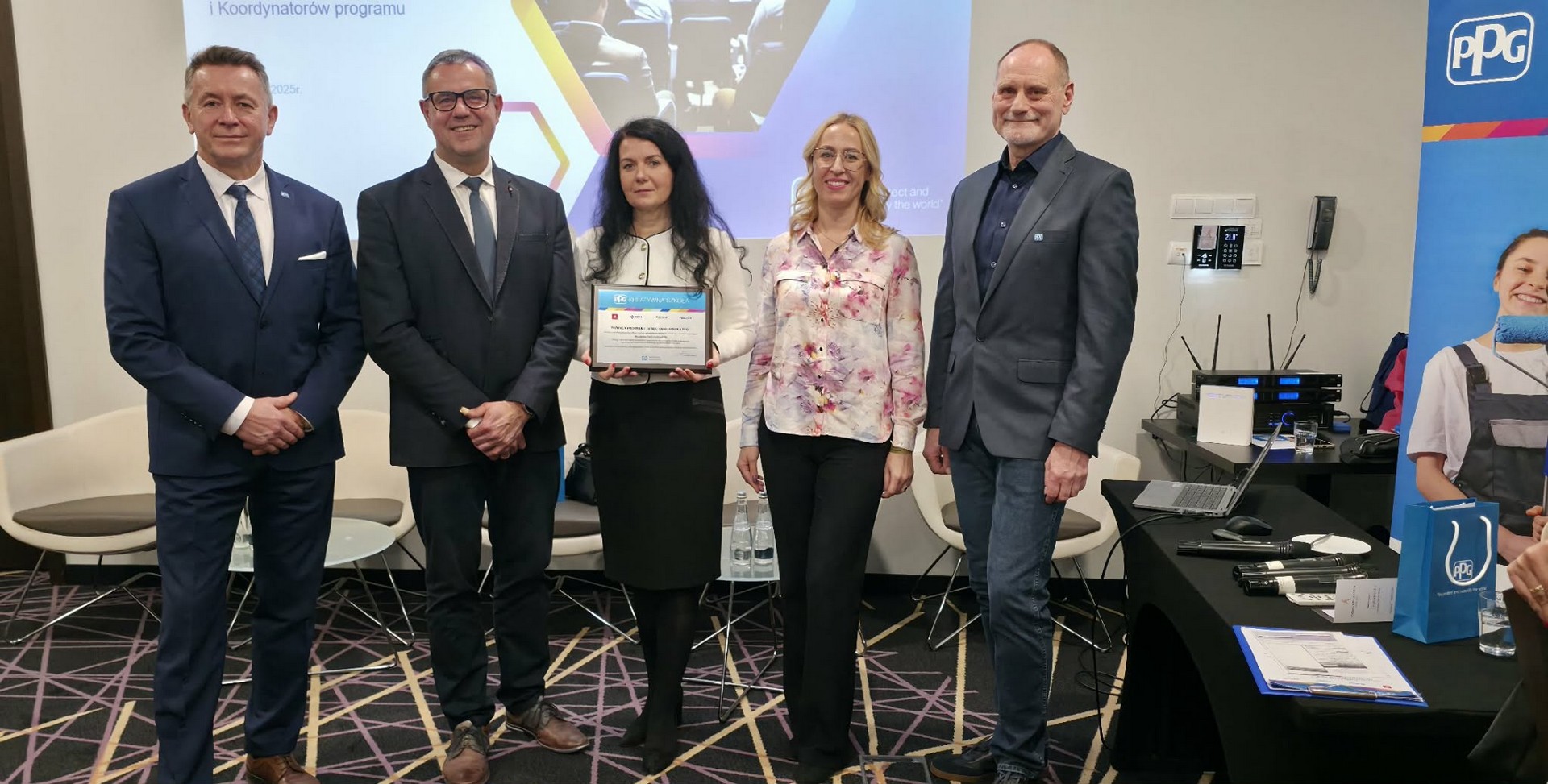 W dniach 8,9 grudnia br. dyrektor szkoły Marcin Kuls wraz nauczycielami koordynatorami Panią Anną Marcysiak i Panią Sandrą Nowakowską brali udział w Konferencji dla Dyrektorów Szkół i Koordynatorów ogólnopolskiego programu edukacyjnego "Kreatywna Szkoła PPG". Podczas konferencji otrzymaliśmy Certyfikat potwierdzający udział szkoły w programie realizowanym przez Akademię Techniczną PPG, którego celem jest rozwój kompetencji zawodowych uczniów szkół o profilu budowlanym oraz promocja nowoczesnych technologii w budownictwie i renowacji. W jednym z paneli spotkania nie zabrakło rozmów i dyskusji na tematy związane z edukacją zawodową uczniów jak i przedstawieniu mocnych i słabych stron kształcenia w zawodach budowlanych. Zostały omówione kierunki dalszego rozwoju programu, programy rabatowe, zaprezentowano innowacyjne produkty PPG oraz programy partnerskie. W podsumowaniu wyrażone zostały wzajemne podziękowania za współpracę, zaangażowanie i wkład w kształtowanie przyszłości młodych profesjonalistów.